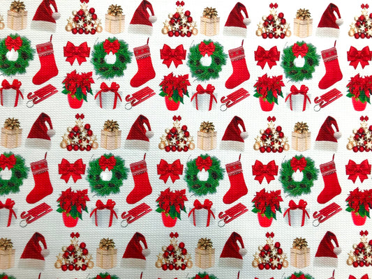 Bullet Knit Christmas Fabric – Festive Holiday Icons Print (Wreaths, Stockings & Santa Hats), 56″ Wide, Sold by the Yard (BPR188)