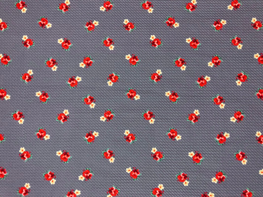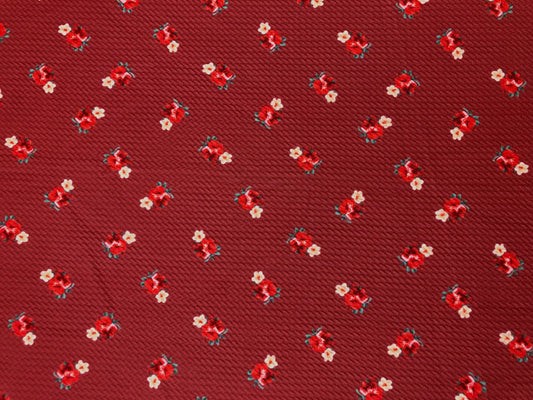 Bullet Knit Fabric – Mini Red Roses & Yellow Bud Ditsy Floral Stretch Print on Brick, 56″ Wide, Sold by the Yard (BDPR257)