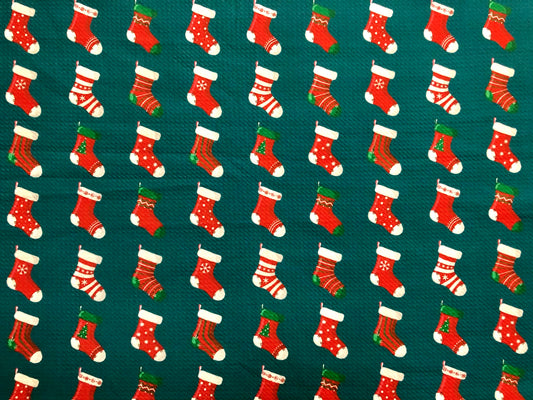 Premium Bullet Knit Fabric – Festive Red Stocking Print on Hunter Green, 4‑Way Stretch, 56″ Wide, Sold by the Yard (BPR190)
