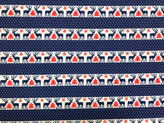 Premium Bullet Knit Holiday Fabric – Nordic Reindeer & Tree Stripe Print in Navy, Red & White, 56″ Wide, Sold by the Yard (BPR191)