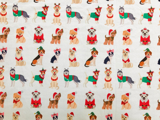 Premium Bullet Knit Fabric – Festive Pups in Santa, Reindeer & Elf Costumes on Ivory, 56″ Wide, Sold by the Yard (BPR196)