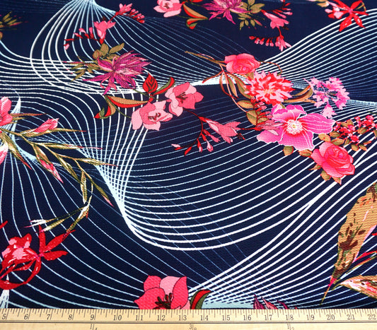 Bullet Knit Fabric – Navy Blue & Pink Airwave Floral Print, 56″ Wide, Sold by the Yard (BPR073)