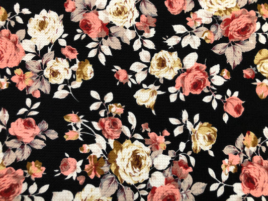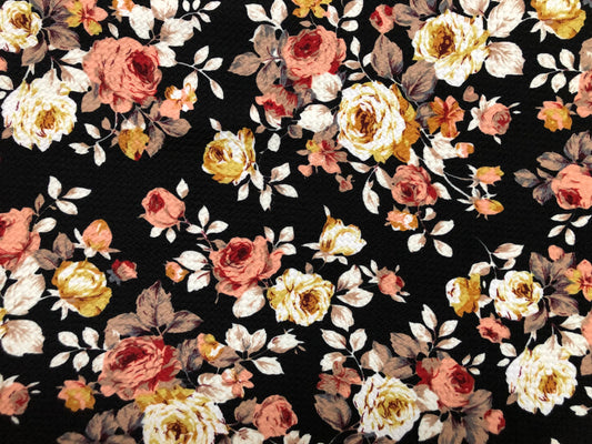 Bullet Knit Fabric – Rose Floral Stretch Print in Mauve & Yellow on Black, 56″ Wide, Sold by the Yard (BPR255)