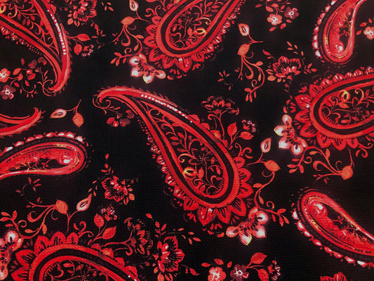 Premium Bullet Knit Fabric – Black & Red Vibrant Paisley Print, 56″ Wide, Sold by the Yard (BPR241)