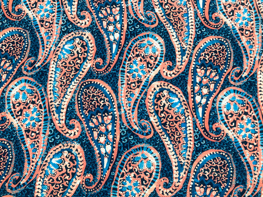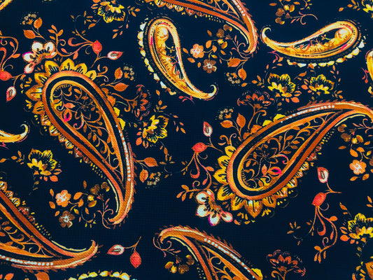 Premium Bullet Knit Fabric – Navy Blue & Rust Orange Paisley Print, 56″ Wide, Sold by the Yard (BPR239)