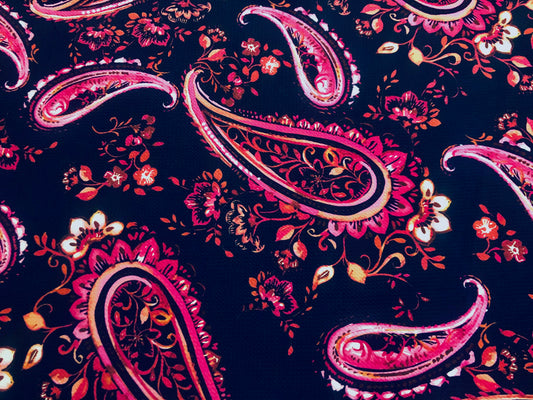 Premium Bullet Knit Fabric – Navy Blue & Magenta Purple Paisley Print, 56″ Wide, Sold by the Yard (BPR240)
