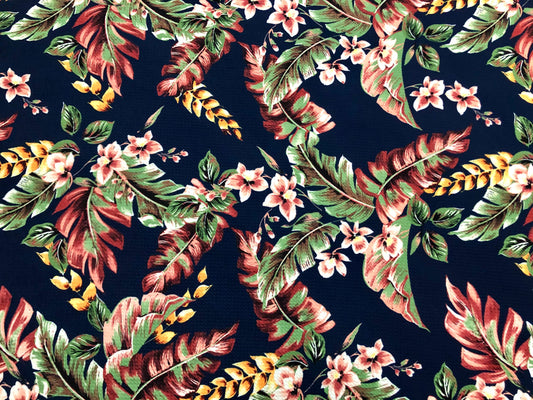 Bullet Knit Fabric – Vibrant Tropical Palm Leaf Print in Peach, Yellow & Rust on Navy Blue, 56″ Wide, Sold by the Yard (BPR233)