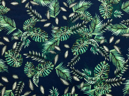 Bullet Knit Fabric – Vibrant Tropical Palm Leaf Print in Green on Navy Blue, 56″ Wide, Sold by the Yard (BPR234)