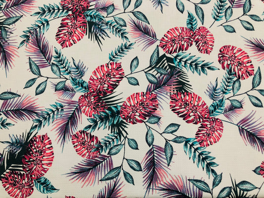 Bullet Knit Fabric – Vibrant Tropical Palm Leaf Print in Red & Pink on Ivory, 56″ Wide, Sold by the Yard (BPR2300)