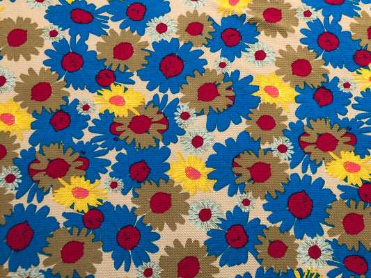 Premium Bullet Knit Fabric – Blue, Beige & Yellow Daisy Floral Print, 56″ Wide, Sold by the Yard (BPR243)