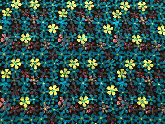 Premium Bullet Knit Fabric – Teal & Yellow Ditsy Floral Print on Black, 56″ Wide, Sold by the Yard (BPR244)