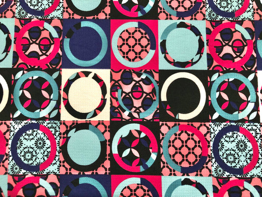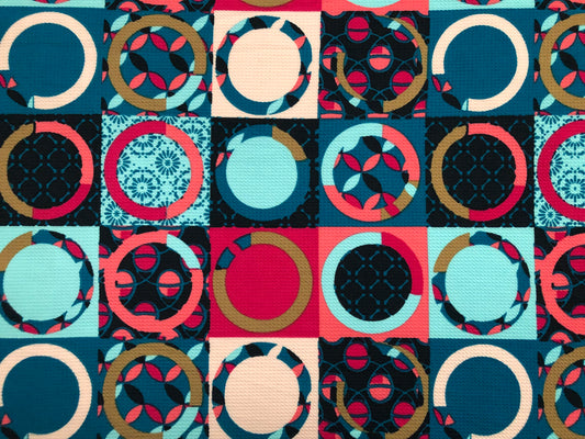 Premium Bullet Knit Fabric – Turquoise, Pink & Red Geometric Circle Mosaic Print, 56″ Wide, Sold by the Yard (BPR247)