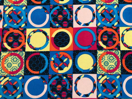 Premium Bullet Knit Fabric – Red, Navy & Light Blue Geometric Circle Mosaic Print, 56″ Wide, Sold by the Yard (BPR246)