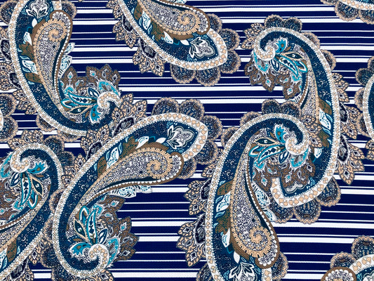 Bullet Knit Fabric – Vibrant Navy Stripes, Teal & Gold Paisley Motif Print on White, 56″ Wide, Sold by the Yard (BPR238)