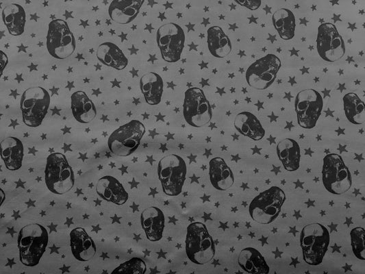 Scuba Techno Knit – Midnight Skulls & Stars – Gray & Black, 4-Way Stretch, 220 GSM, 56" Wide – Wrinkle-Resistant – Sold by the Yard (SCTPR09)