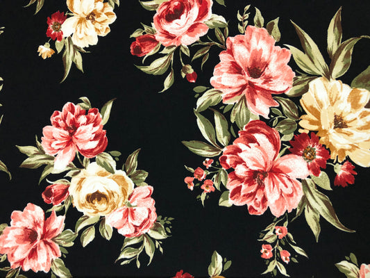 Techno Crepe Knit Fabric – Silky Drape, 4-Way Stretch, Wrinkle-Resistant, 56″ Wide, 240 GSM – Black/Burgundy/Blush/Gold Floral with Green Leaves – Sold by the Yard (TCRP020)