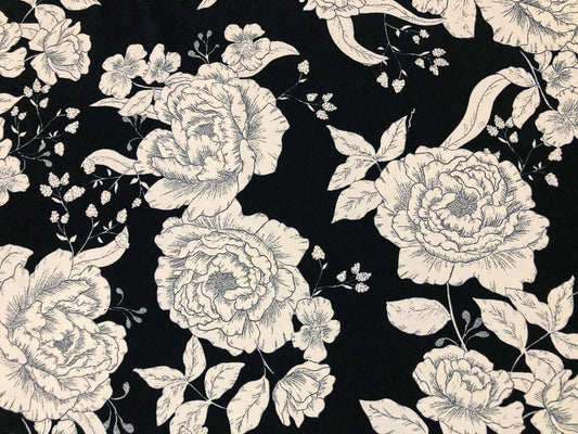 Techno Crepe Knit Fabric – Silky Drape, 4-Way Stretch, Wrinkle-Resistant, 56″, 240 GSM – Black/Ivory Sketch Floral – Sold by the Yard (TCRP083)