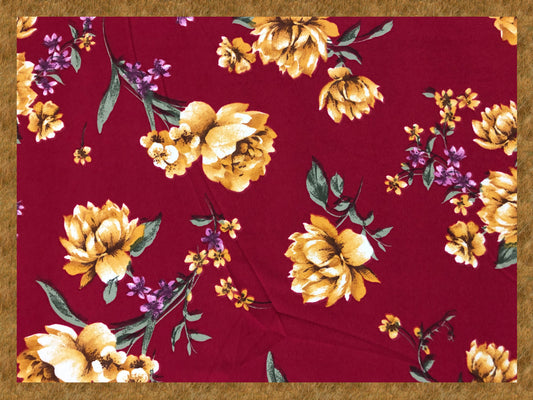 Techno Crepe Knit Fabric – Silky Drape, 4-Way Stretch, Wrinkle-Resistant, 56″, 240 GSM – Burgundy/Gold Floral with Lilac – Sold by the Yard (TCRP023)