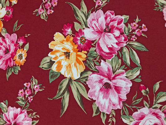 Techno Crepe Knit Fabric – 4-Way Stretch, Silky Drape, Wrinkle-Resistant, 56″ Wide, 240 GSM – Burgundy/Pink/Gold Floral with Green Leaves – Sold by the Yard (TCRP018)