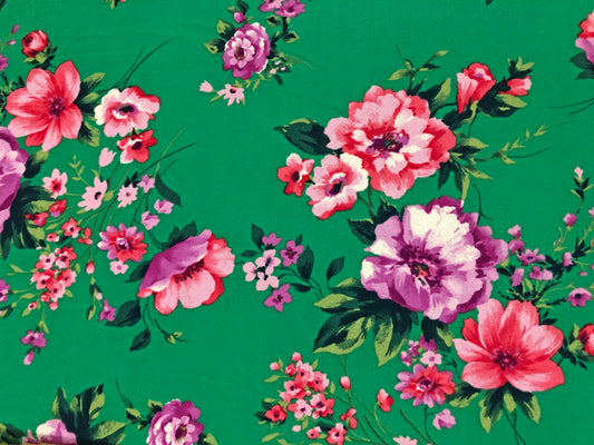 Techno Crepe Knit Fabric – Silky Drape, 4-Way Stretch, Wrinkle-Resistant, 56″ Wide, 240 GSM – Intense Green/Pink/Magenta/Purple Floral – Sold by the Yard (TCRP016)