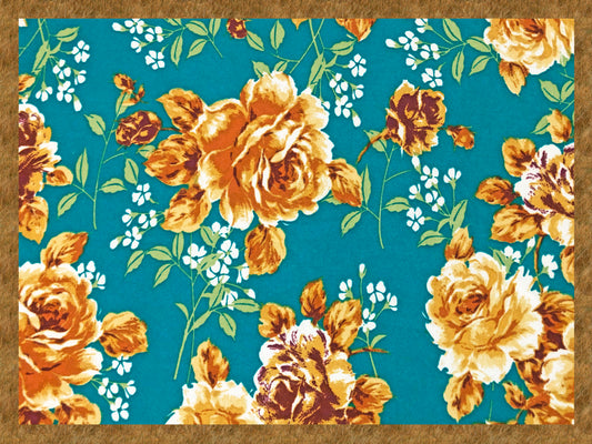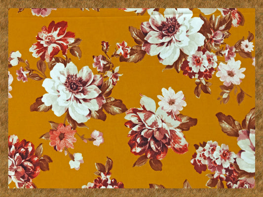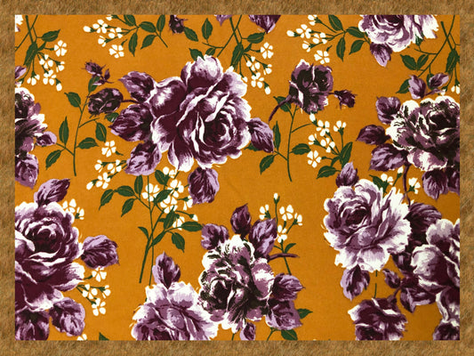 Crepe Knit Fabric – Mustard Ochre with Plum & Lavender Roses, Forest-Green Leaves – 4-Way Stretch, 56" Wide, 240 GSM, Silky Drape (TCRP025)