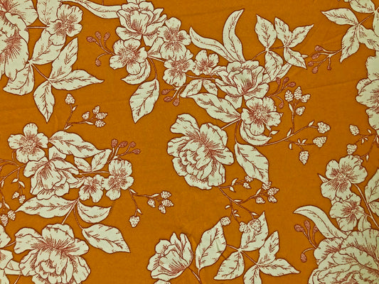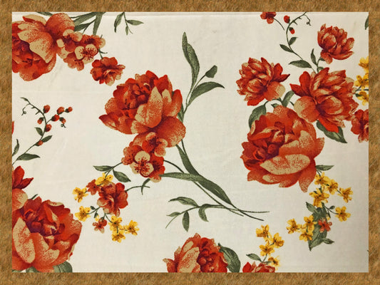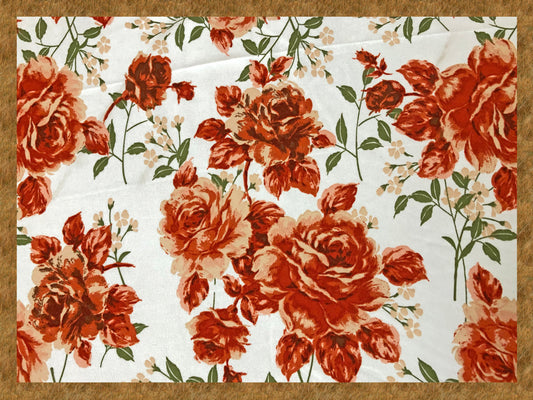 Techno Crepe Knit Fabric – Silky Drape, 4-Way Stretch, Wrinkle-Resistant, 56″, 240 GSM – White/Burnt Orange Rose Floral – Sold by the Yard (TCRP027)