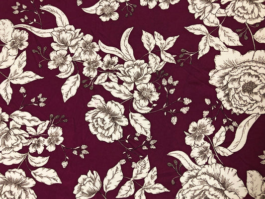 Techno Crepe Knit Fabric – Silky Drape, 4-Way Stretch, Wrinkle-Resistant, 56″, 240 GSM – Maroon & Ivory Sketch Floral – Sold by the Yard (TCRP085)