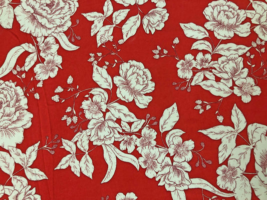 Techno Crepe Knit Fabric – Silky Drape, 4-Way Stretch, Wrinkle-Resistant, 56″, 240 GSM – Red Orange/Ivory Sketch Floral – Sold by the Yard (TCRP086)