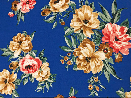 Techno Crepe Knit Fabric – 4-Way Stretch, Silky Drape, Wrinkle-Resistant, 56″ Wide, 240 GSM – Royal Blue/Caramel/Red Floral with Green Leaves – Sold by the Yard (TCRP019)