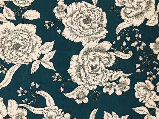 Techno Crepe Knit Fabric – Silky Drape, 4-Way Stretch, Wrinkle-Resistant, 56″, 240 GSM – Teal/Ivory Sketch Floral – Sold by the Yard (TCRP084)