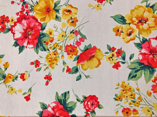 Techno Crepe Knit Fabric – 4-Way Stretch, Silky Drape, Wrinkle-Resistant, 56″ Wide, 240 GSM – White/Red/Yellow Floral with Green Leaves – Sold by the Yard (TCRP015)