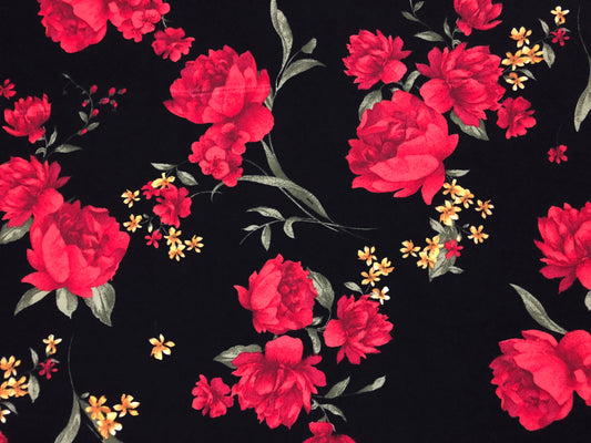 Techno Crepe Knit – Black with Red Peonies & Golden Blossoms, 4-Way Stretch, 56" Wide, 240 GSM - By the Yard (TCRP060)
