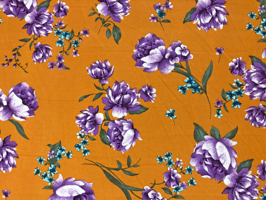 Techno Crepe Knit – Mustard with Purple Peony & Teal Blossoms, 4-Way Stretch, 56" Wide, 240 GSM - By the Yard (TCRP057)