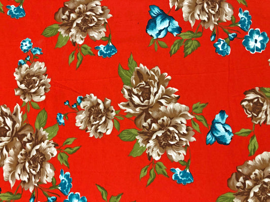 Techno Crepe Knit – Red Orange with Brown Roses & Teal Blossoms, 4-Way Stretch, 56" Wide, 240 GSM, - By the Yard (TCRP064)