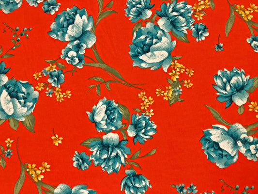 Techno Crepe Knit – Red Orange with Olive Roses & Teal Blossoms, 4-Way Stretch, 56" Wide, 240 GSM - By the Yard (TCRP058)
