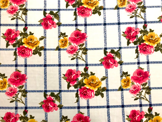 Techno Crepe Knit Fabric – 4-Way Stretch, Silky Drape, Wrinkle-Resistant, 56″ Wide, 240 GSM – Rose Floral on Navy Grid (White/Pink/Yellow/Green) – Sold by the Yard (TCRP05)