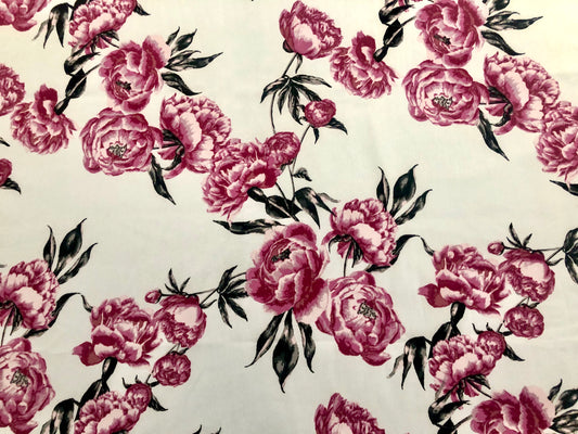 Scuba Techno Knit Fabric — White with Fuchsia/Rose Peony Floral, Soft-Touch Double Knit, 4-Way Stretch, 56″ Wide, 220 GSM — By the Yard (SCTPR021)