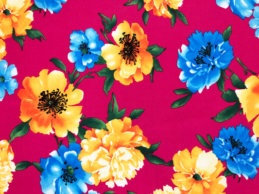 Techno Crepe Knit – Fuchsia Floral (Yellow/Blue/Green/White)- 4-Way Stretch, 240 GSM, 56" Wide, Double Knit – Sold by the Yard (TCRP0114)