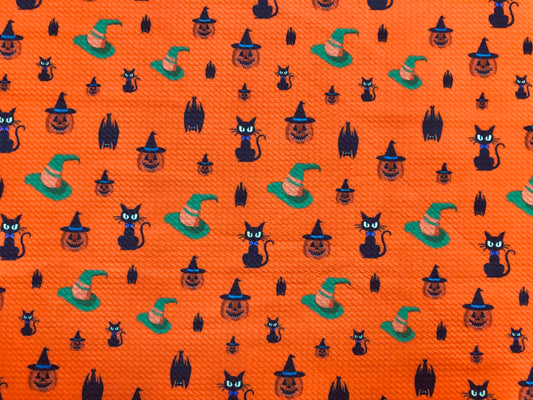 Bullet Knit Halloween Fabric – Black Cats, Witch Hats & Jack‑O’‑Lantern Print on Intense Orange, 56″ Wide, Sold by the Yard (BPR183)