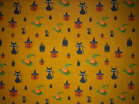 Premium Bullet Knit Halloween Fabric – Black Cats, Witch Hats & Jack‑O’‑Lantern Print on Mustard, 56″ Wide, Sold by the Yard (BPR184)