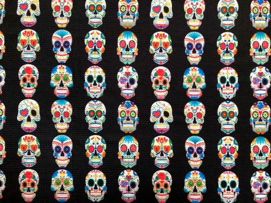 Bullet Knit Fabric –Sugar Skull Day of the Dead Colorful on Black Print, 56″ Wide, Sold by the Yard (BPR185)