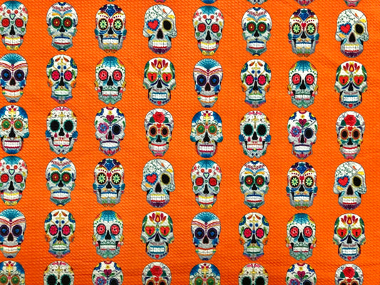 Premium Bullet Knit Fabric –Sugar Skull Day of the Dead Colorful on Vibrant Orange Print, 56″ Wide, Sold by the Yard (BPR186)