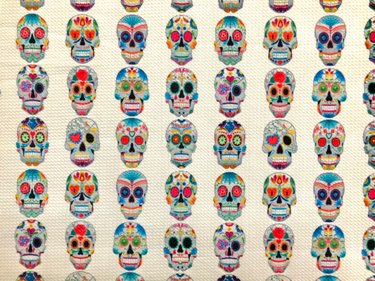 Bullet Knit Fabric –Sugar Skull Day of the Dead Colorful on Ivory Print, 56″ Wide, Sold by the Yard (BPR187)