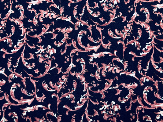 Liverpool Knit — Mauve Baroque Scroll on Navy — 56″ Wide, 200 GSM, 4-Way Stretch — Sold by the Yard (LVPR244)