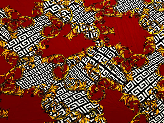 Liverpool Knit Fabric – Red & Gold Baroque Scroll on Black/White Greek Key, 4-Way Stretch, 56” Wide, 200 GSM – Sold by the Yard (LVPR263)