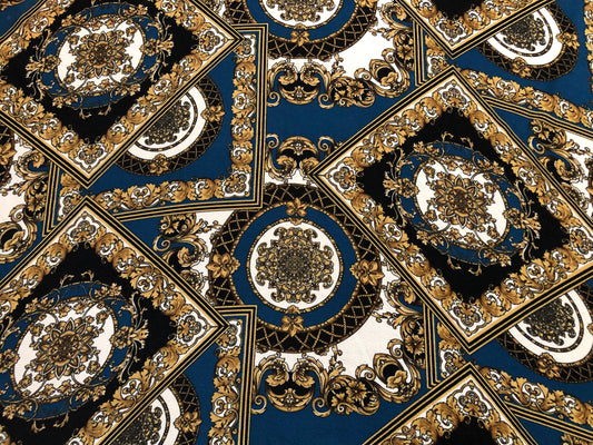 Liverpool Knit – Teal & Gold Baroque Medallion – 4-Way Stretch, 56” Wide, 200 GSM – Sold by the Yard (LVPR265)