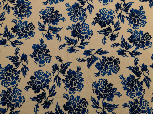 Liverpool Knit Fabric – Beige & Blue Cobalt Peony Floral – 4-Way Stretch, 56” Wide, 200 GSM – Sold by the Yard (LVPR256)