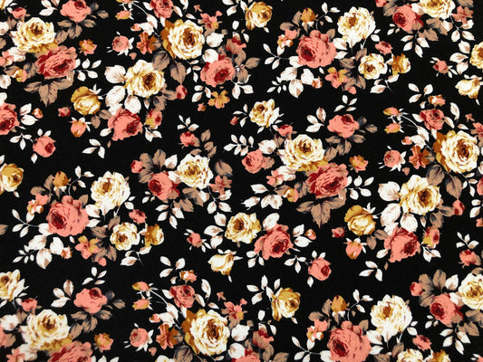 Liverpool Knit – Yellow/Mauve & White Roses on Black Floral – 4-Way Stretch, 56″ Wide, 200 GSM – Sold by the Yard (LVPR075)