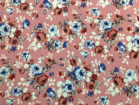 Liverpool Knit – Blue/White & Mauve Vintage Roses & White Leaves on Vivid Pink Floral – 4-Way Stretch, 56″ Wide, 200 GSM – Sold by the Yard (LVPR038)