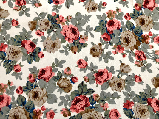 Liverpool Knit – Pink/Taupe Vintage Roses & Gray Leaves on Ivory Floral – 4-Way Stretch, 56″ Wide, 200 GSM – Sold by the Yard (LVPR023)